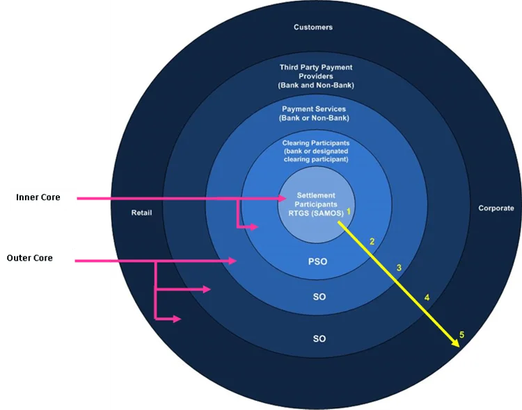 The National Payment System (NPS) categorizes participants into five levels, ranging from the inner-core to the outer-core. CIBA members are registered as System Operators (SO), Third-Party Payment Providers (TPPP), and FinTechs, and form part of the middle-core participants, classified as levels 3 and 4